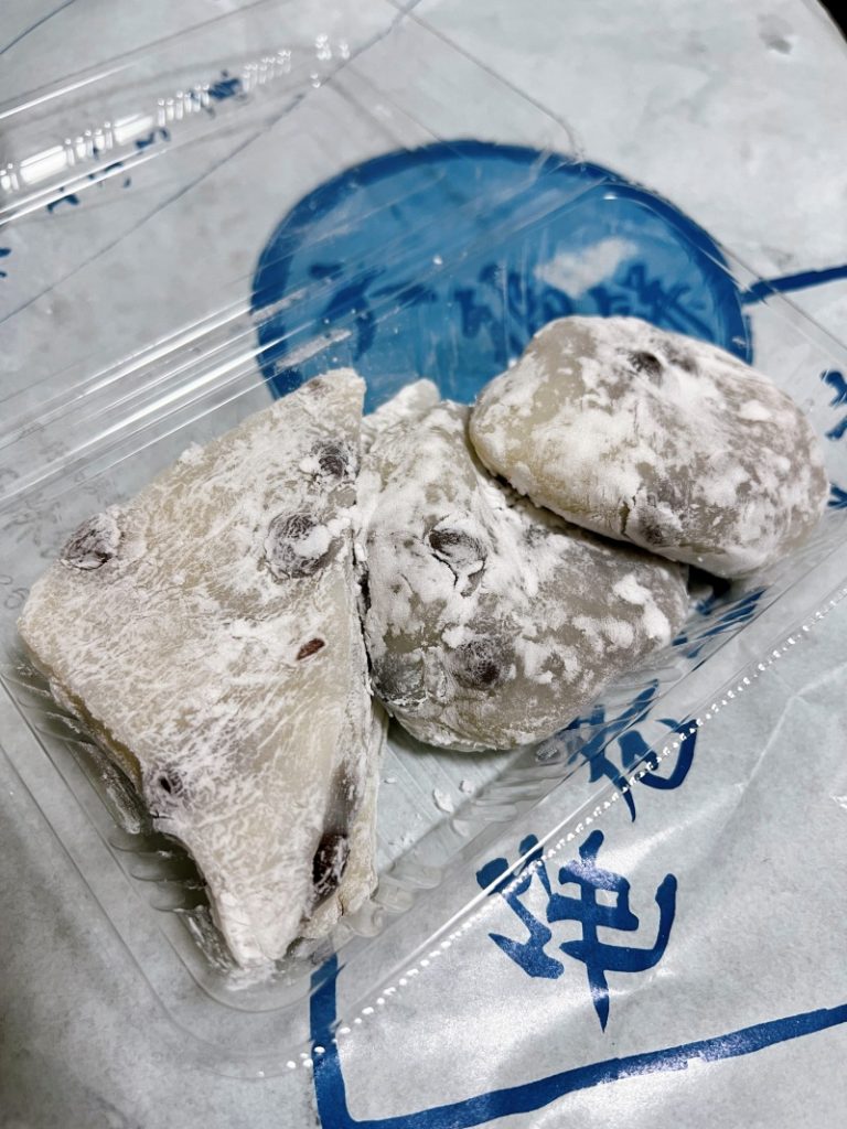 朝 豆餅2個、豆大福2個、レッドブル