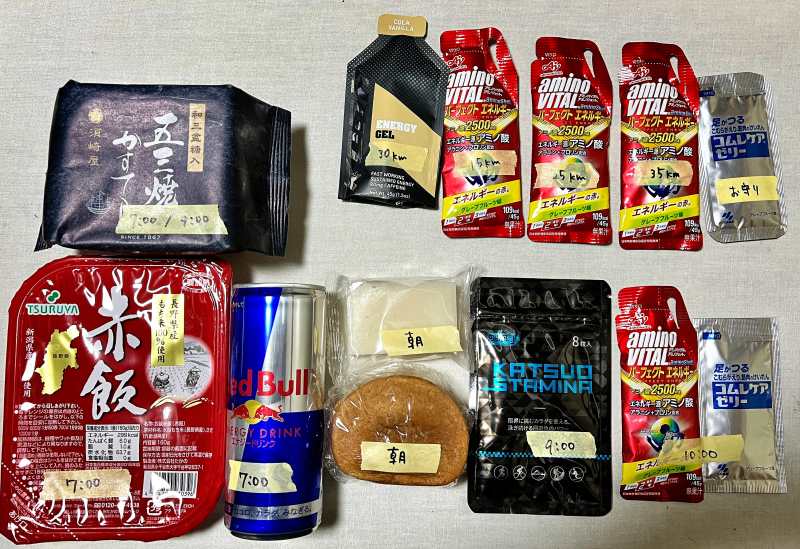 7:00頃(移動中)・・・赤飯1パック、カステラ2切れ、レッドブル1本