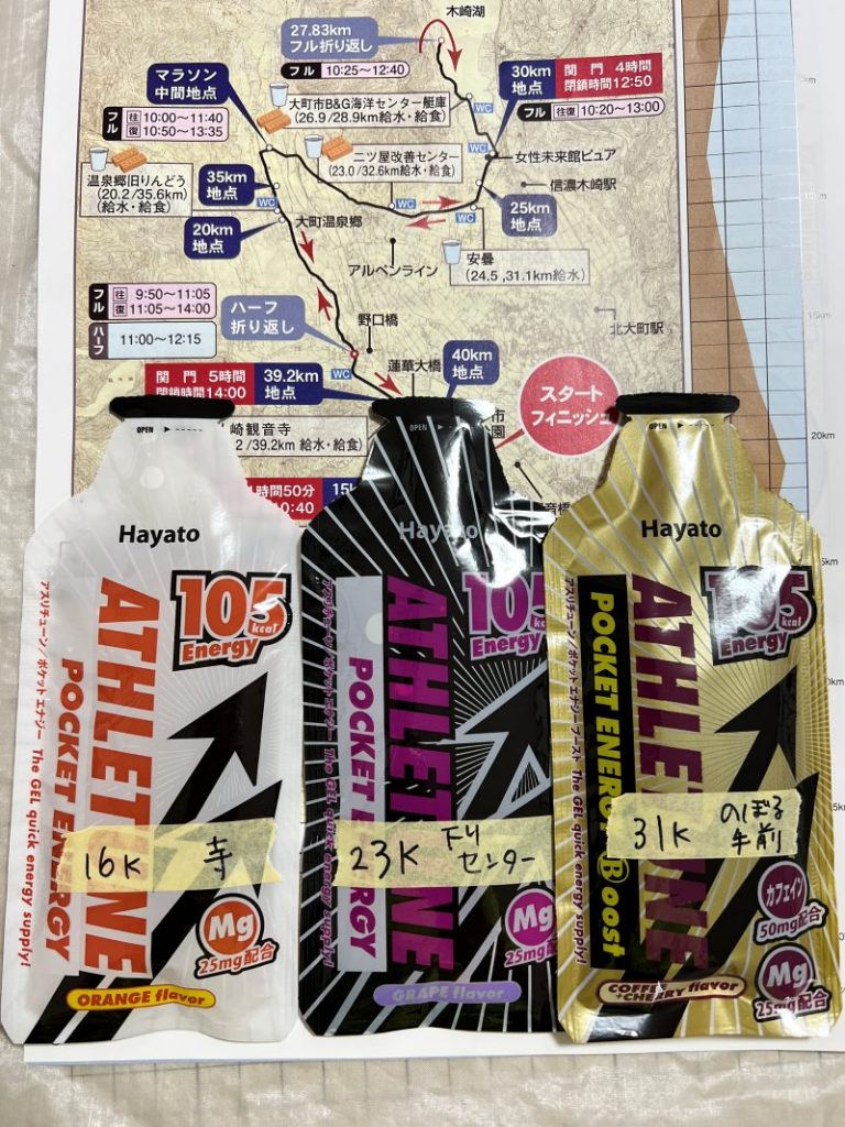 レース中のジェル補給は、摂り忘れることなくちゃんと計画通りに摂取できた。今回ややペースを抑え気味に走ったので、補給をしっかり摂れた。